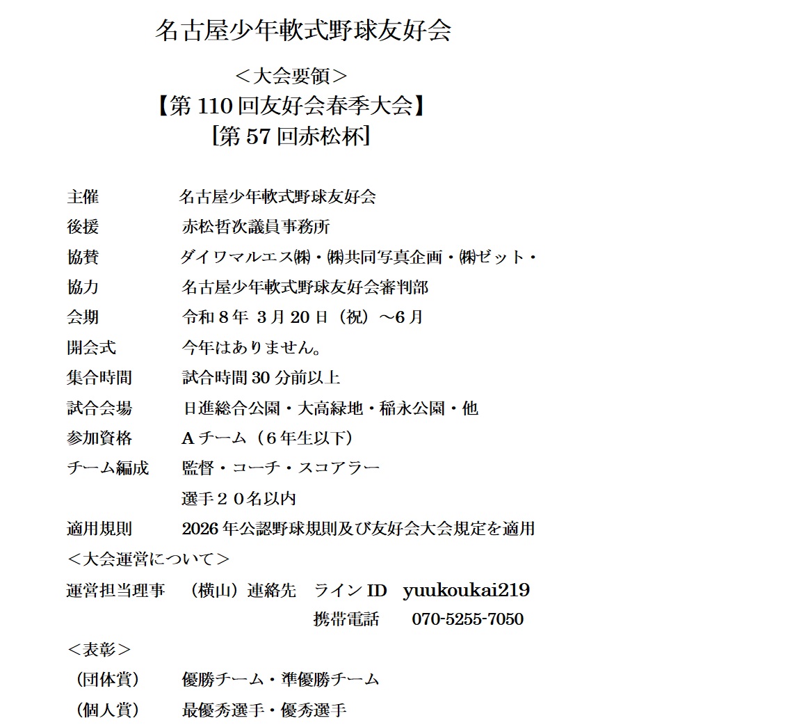 第57回赤松杯-友好会春季大会(6年生以下)のご案内第57回赤松杯-友好会春季大会(6年生以下)を下記の要領にて開催致します。